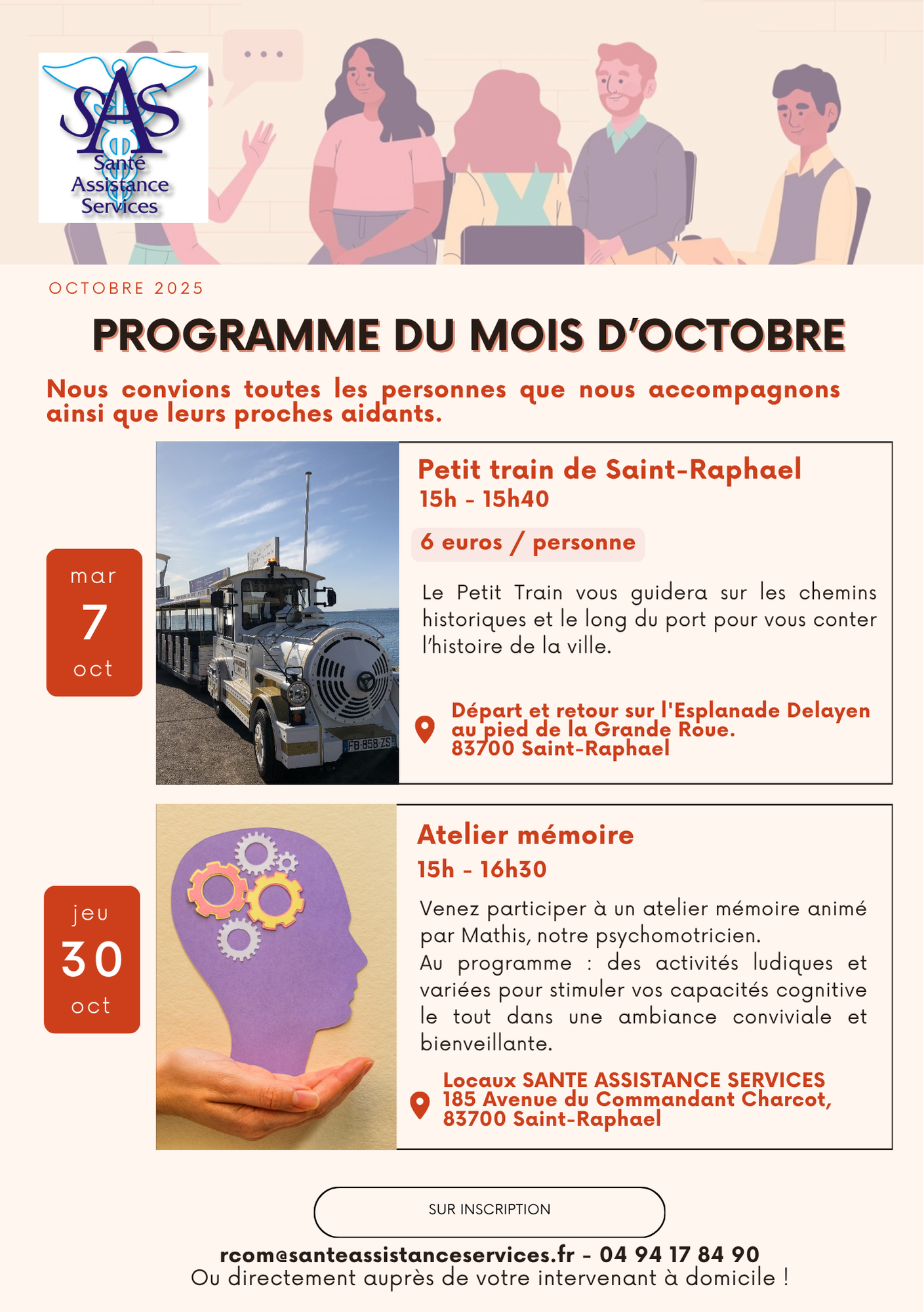 - 7 Octobre : Petit train de Saint-Raphael. 6 euros / pers. - 30 Octobre : Atelier mémoire.